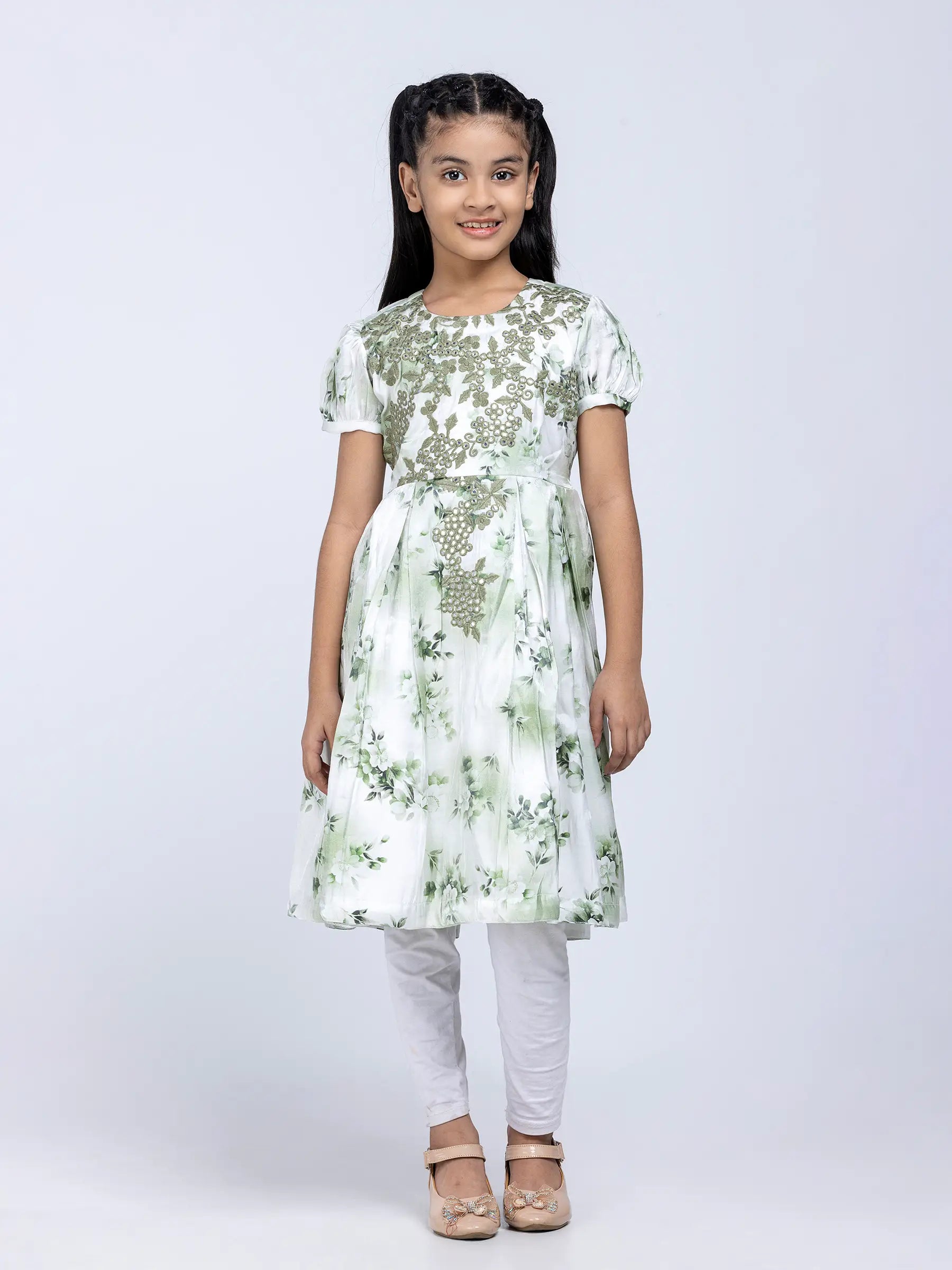 White and green printed mixed cotton frock with sage green embroidery.
