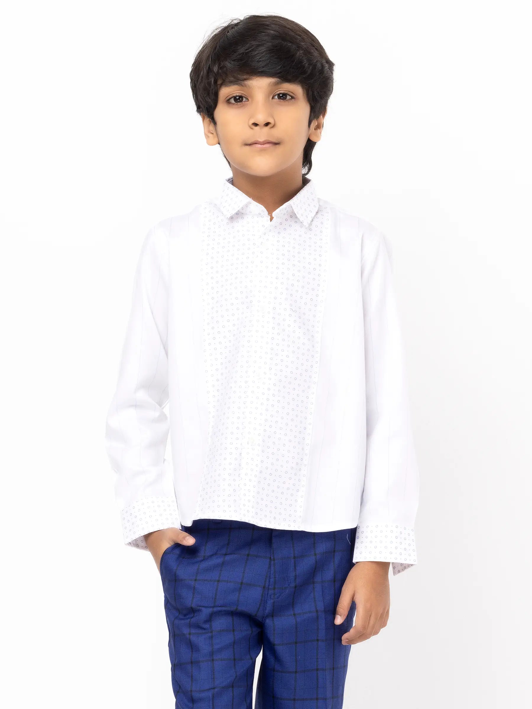 White printed viscose partywear shirt. Comes with blue check viscose pant.